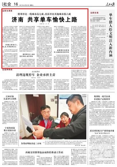 《人民日?qǐng)?bào)》2017年04月25日16版刊發(fā)文章《使用率比一線城市高七成,投訴率比其他城市低六成 濟(jì)南 共享單車愉快上路(民生調(diào)查)》,點(diǎn)贊濟(jì)南治理共享單車路徑,用制度化解難題,解決“最后一公里”的問題。