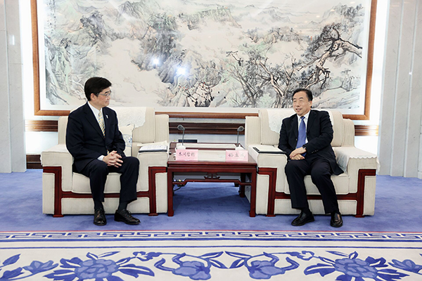 中國駐大阪總領(lǐng)事館前總領(lǐng)事李天然,市委常委、副市長鄭德雁參加會見。