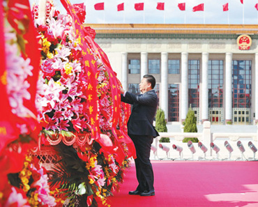 習近平邁步上前,仔細整理花籃緞帶。接著,習近平等黨和國家領(lǐng)導人緩步繞行,瞻仰人民英雄紀念碑。